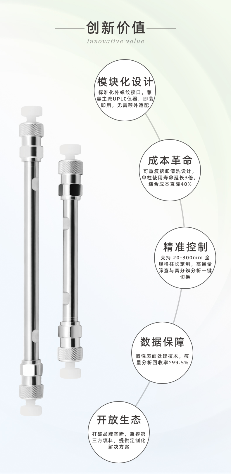 液相色譜柱是實(shí)現(xiàn)分離的核心部件,要求柱效高、柱容量大和性能穩(wěn)定。柱性能與柱結(jié)構(gòu)、填料特性、填充質(zhì)量和使用條件有關(guān)。恒譜生2.1*250mm超高壓液相色譜色譜柱空柱管總成采用高純度316L型材質(zhì),通過(guò)精密加工而成,保證hplc色譜柱制成品的高性能;死體積很小,管內(nèi)壁光滑【光潔度:0.08μ】,橫截面均勻呈圓形;不銹鋼色譜柱管頭保證死體積和柱外體積,無(wú)泄露密封;種類齊全,從分析、半制備型到制備型等多種規(guī)格;篩板可以反復(fù)拆卸或更換,柱體為空可以裝入填料。高性能色譜柱空柱管,不僅能減少更換色譜柱帶來(lái)的重新進(jìn)行方法驗(yàn)證、條件摸索等工作時(shí)間,還大大減低使用成本。
