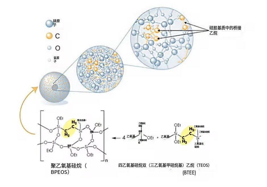 當(dāng)流動(dòng)相 pH>8 時(shí),硅膠骨架中的硅氧烷鍵(–Si–O–Si–)易發(fā)生水解,導(dǎo)致硅膠基質(zhì)溶解。為拓展色譜柱的 pH 適用范圍,行業(yè)內(nèi)開(kāi)發(fā)了雜化顆粒技術(shù),其核心是在二氧化硅網(wǎng)狀骨架中引入有機(jī)基團(tuán)(通常為乙基或甲基),形成有機(jī) – 無(wú)機(jī)雜化基質(zhì)。
