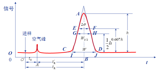 ? 峰寬W:通過色譜峰兩側(cè)的拐點(diǎn)作切線,在基線上的截距稱為峰寬,或稱基線寬度,也可用W表示,如圖IJ 的距離。根據(jù)正態(tài)分布的原理 ,可證得峰寬和標(biāo)準(zhǔn)差的關(guān)系是W=4σ。