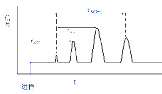 I為待測物質(zhì)i在某固定液X上的保留指數(shù),選取兩個正構(gòu)烷烴作為基準(zhǔn)物質(zhì),其中一個的碳數(shù)為N,另一個為N+n,它們的調(diào)整保留時間分別為t’R(N)和 t’R(N+n),使待測物質(zhì)i的調(diào)整保留時間t’R(i)恰好于兩者之間,即t’R(N)<t’R(i)<t’R(N+n)。將含物質(zhì)i和所選的兩個正構(gòu)烷烴的混合物注入其固定液X的色譜柱,在一定溫度條件下繪制色譜圖。